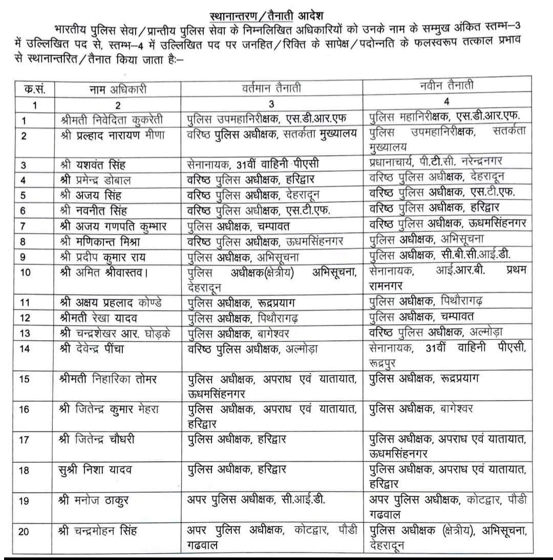 उत्तराखंड पुलिस विभाग ने तत्काल प्रभाव से 20 अधिकारियों के स्थानांतरण/तैनाती के आदेश जारी किए हैं। नीचे सभी अधिकारियों के नाम और उनकी नई तैनाती की जानकारी दी गई है: